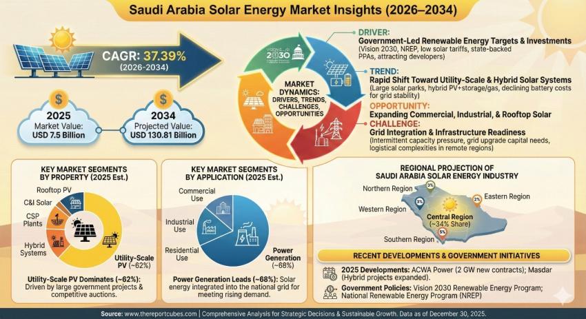 The Saudi Arabia Solar Energy Market is anticipated to register a CAGR of 37.39% during the forecast period 2026&-2034. The market size was valued at USD 7.5 billion in 2025 and is projected to reach USD 130.81 billion by 2034. This exceptional growth trajectory reflects Saudi Arabia’s strategic shift toward renewable energy under Vision 2030, aimed at reducing dependence on fossil fuels while meeting rapidly rising electricity demand.