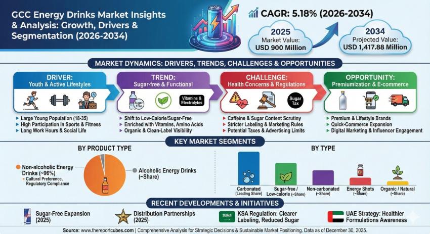 The GCC Energy Drinks Market is anticipated to register a CAGR of 5.18% during 2026-2034. The market size was valued at USD 900 million and is projected to reach USD 1,417.88 million by 2034. This steady growth reflects changing consumer lifestyles, a young and active population base, and rising demand for functional beverages that enhance energy, alertness, and physical performance. Energy drinks have transitioned from niche products to mainstream beverages across GCC countries, particularly among urban youth, working professionals, and fitness-oriented consumers.