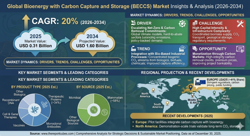 The Global Bioenergy with Carbon Capture and Storage (BECCS) Market is anticipated to register a CAGR of 20% during the forecast period 2026-2034. The market size was valued at USD 0.31 Billion in 2025 and is projected to reach USD 1.60 Billion by 2034. This growth reflects the increasing urgency among governments and industries to deploy negative emissions technologies capable of removing carbon dioxide from the atmosphere while simultaneously producing energy. BECCS is emerging as a critical solution within global decarbonization pathways, particularly for sectors where direct emission reduction remains technically or economically challenging.