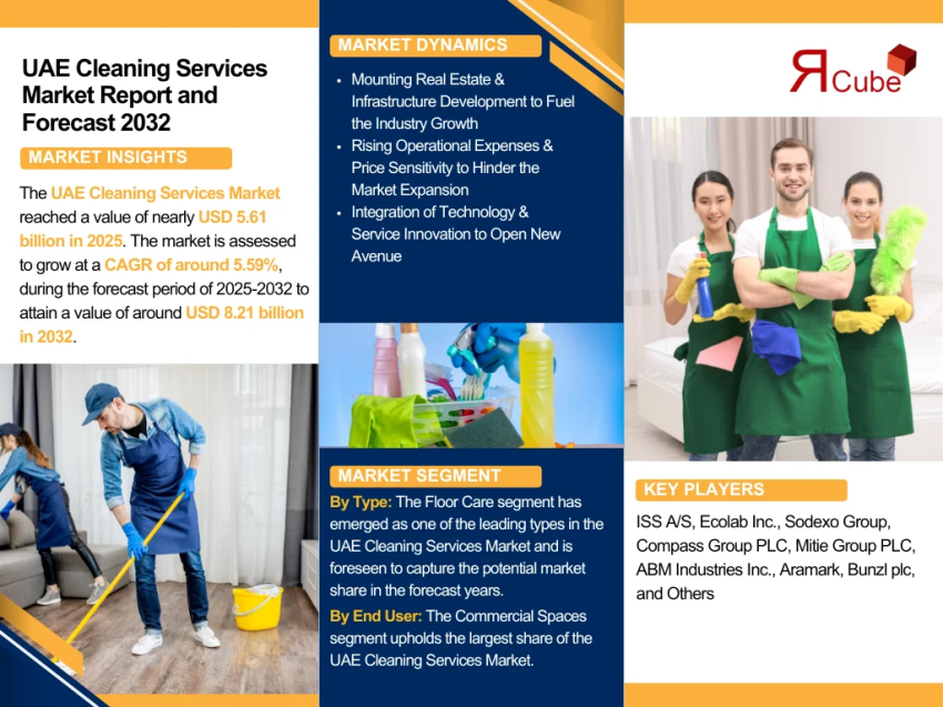 The UAE Cleaning Services Market is assessed to grow at a CAGR of around 5.59%, during the forecast period of 2025-2032 to attain a value of around USD 8.21 billion in 2032.