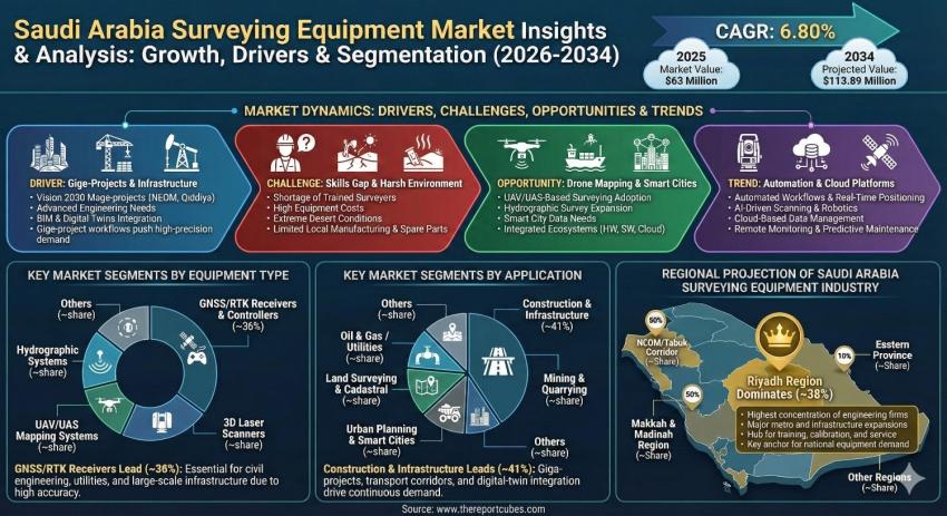 The Saudi Arabia Surveying Equipment Market is projected to grow at a 6.80% CAGR during 2026-2034. The market stood at USD 63 million in 2025 and is expected to reach USD 113.89 million by 2034.