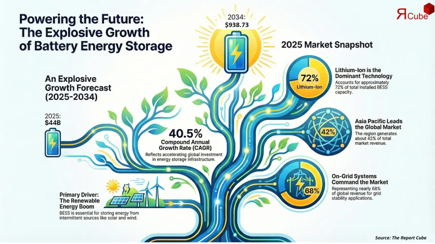 The Global Battery Energy Storage System Market is anticipated to register a CAGR of 40.5% during the forecast period 2026–2034. The market size was valued at USD 44 Billion in 2025 and is projected to reach USD 938.73 Billion by 2034. This extraordinary growth trajectory reflects the accelerating global transition toward renewable energy, grid modernization, and electrification of end-use sectors. Battery energy stora... moreBattery Energy Storage System Market Trends, Drivers, and Forecast 2026–2034