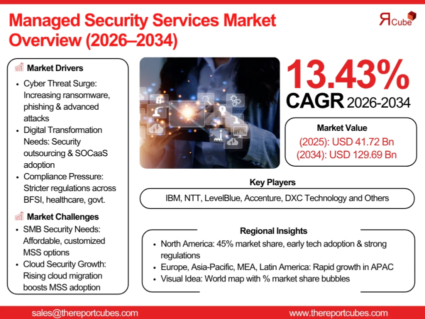 The Managed Security Services Market is anticipated to register a CAGR of around 13.43% during the forecast period, 2026-34. Additionally, the market size was valued at nearly USD 41.72 billion in 2025 and is projected to reach almost USD 129.69 billion by 2034.